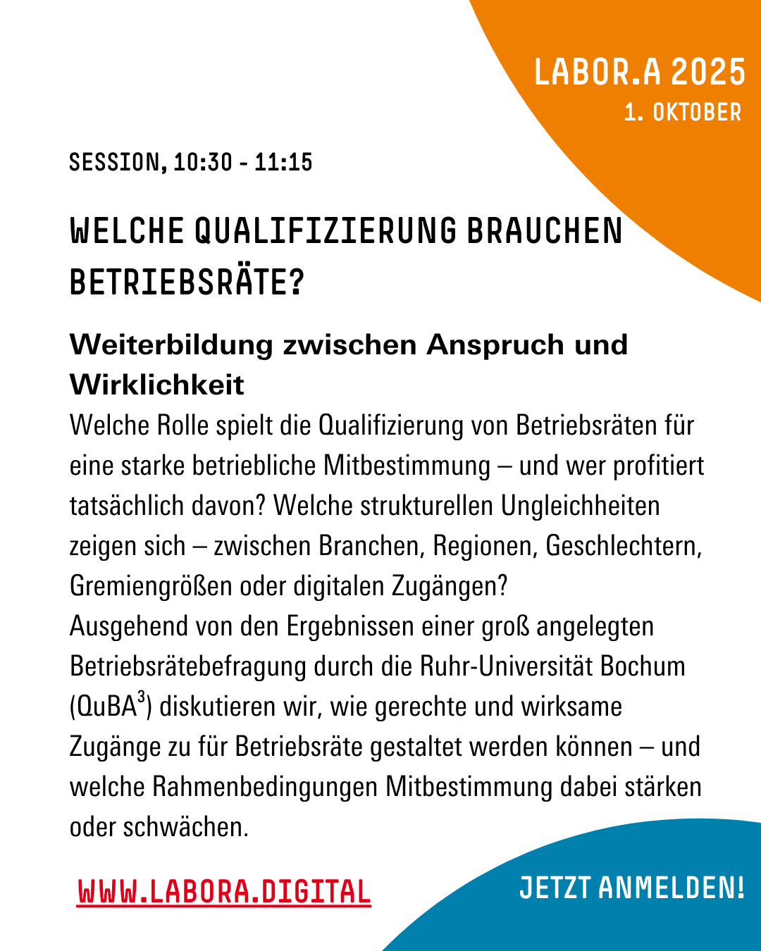 Fabian Hoose from the Centre of Cooperation RUB/IGM will discuss the results of the large-scale works council survey conducted as part of the QuBA³ research project with Oliver Venzke during a session at LABOR.A on 1 October (10:30–11:15 a.m.). The focus will be on the question of how fair and effective access to training for works council members can be designed. The session will take place on site in the “Asgabat” room, and anyone interested is still welcome to participate online.