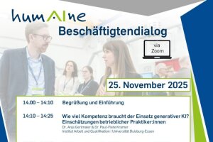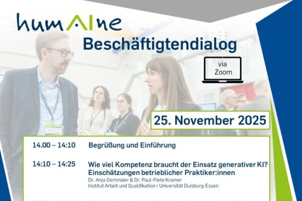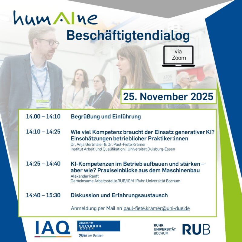 Das Institut Arbeit und Qualifikation (Universität Duisburg-Essen) lädt herzlich dazu ein, gemeinsam zu erörtern, wie ein nachhaltiger und kompetenter Umgang mit generativer KI in der Arbeitswelt gelingen kann.